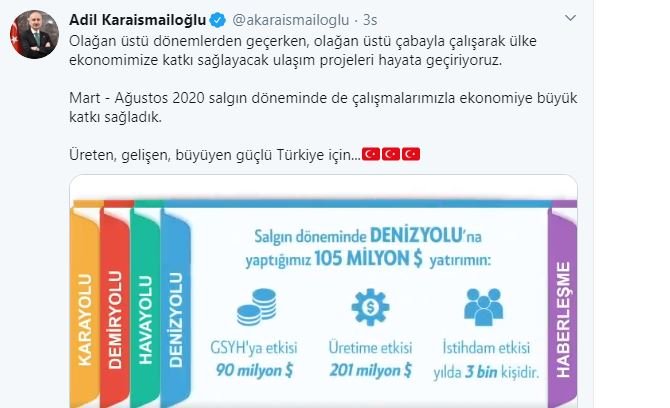 Ulaştırma ve Altyapı Bakanı Adil Karaismailoğlu, sosyal medya hesabı Twitter’dan Bakanlığın denizyolu için yaptığı yatırımı ve yatırımın ekonomik sonuçlarını paylaştı.