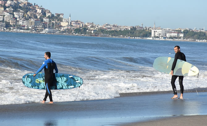 Denizde dalganın güçlü olduğunu görünce hemen fırsatı değerlendirdiklerini ifade eden Dalgıç, "Suyun 18-19 derece olması buna imkan sağlıyor. Şu an memleketimizin pek çok noktasında kar yağıyor, kış şartları hakim ama biz burada güneşin altında dalgaların ve denizin tadını çıkarıyoruz" dedi.