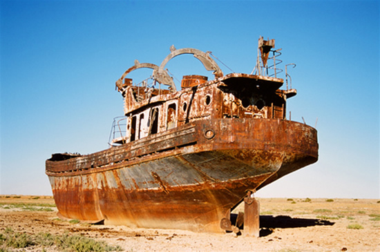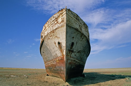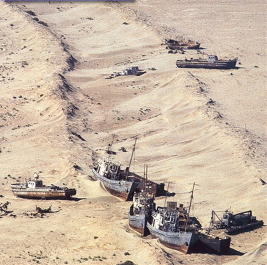 Gölün hırçın dalgalarının bir zamanlar dövdüğü kıyılar, şimdi adeta gemi mezarlığına dönüşmüş durumda. Göldeki suların çekilmesiyle işlevsiz kalan gemiler, bir zamanlar sularında yüzdükleri gölün havzasındaki kumlara oturmuş durumda. Artık bu gemileri harekete geçirecek ne su ve bu gemilerin taşıyacağı yolcu ve yük var. Bir sıralar balıkların süzgeç çarptığı gemi aralarında ise şimdi İpek Yolu kervanlarını andıran deve sürüleri cirit atıyor.