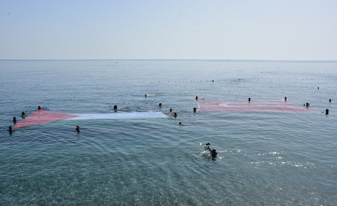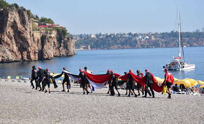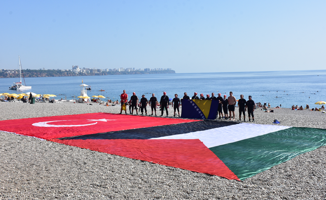 Sahilde dalgıç kıyafetleri giyen arama kurtarma ekipleri, dev Türk ve Filistin bayrakları ile denize girdi. Yaklaşık 25 kişilik ekibin katıldığı eylemde bayraklar deniz yüzeyinde açıldı, plajda güneşlenen tatilciler de bayrakların açılmasına alkışlarla destek oldu. O anlar cep telefonu kameralarıyla kayıt altına alındı.