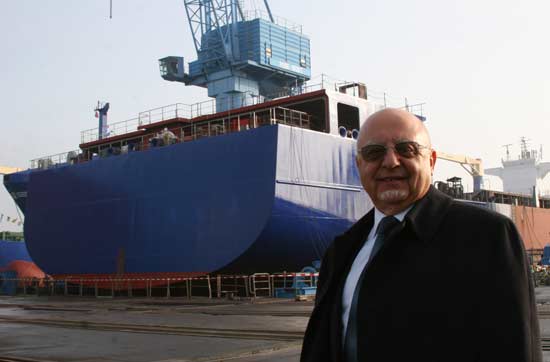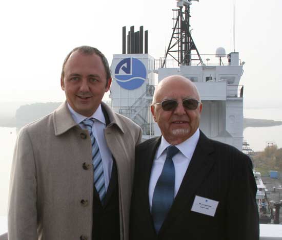 Gemi teslim törenine katılan iki basın mensubundan biri olan Perşembe Rotası Editörü Selçuk Onur, Arkas Yönetim Kurulu Başkanı Lucien Arkas ile DenizHaber objektiflere poz verdi.