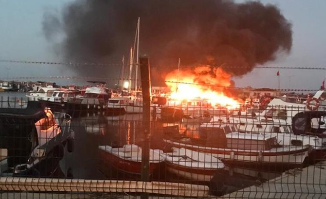 Henüz bilinmeyen bir nedenle başlayan kısa sürede büyüyerek diğer teknelere sıçradı. Alev alev yanan 7 adet tekne kullanılamaz hale gelirken, itfaiye ekiplerinin müdahalesiyle diğer teknelere sıçraması engellendi. Yanan teknelerin bazıları söndürme çalışmaları sırasında battı.