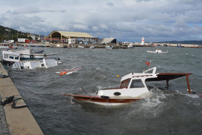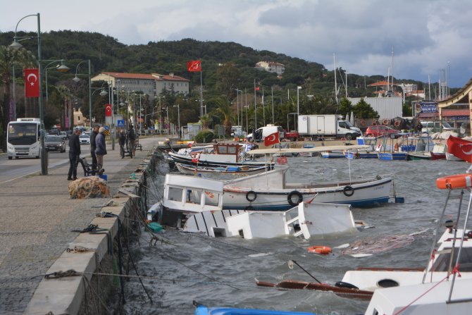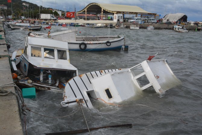 İlçe merkezindeki Kemalpaşa Mahallesi Atatürk Caddesi sahil boyunda etkili olan şiddetli fırtına nedeniyle kıyıya bağlı olan 5 balıkçı teknesi parçalanarak battı.
