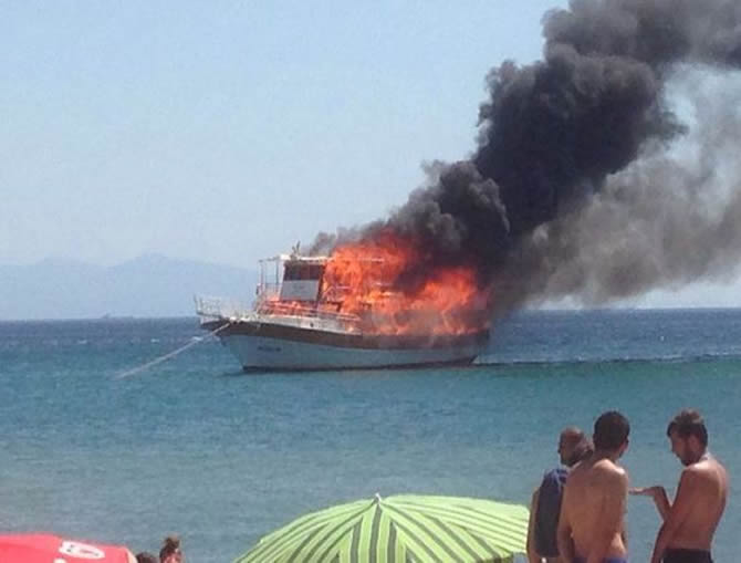 Gerek yaz sezonu gerekse mevsim normalleri üzerinde seyreden hava sıcaklığı nedeniyle en yoğun zamanlarını yaşayan Sarımsaklı plajında denize girenler, Perşembe günü tekne yangınının şokunu yaşadı. Alınan bilgiye göre; Oktay Sarp’a ait Doğanay isimli tur teknesinde saat 14.30’da yangın çıktı. Oteller bölgesi ön tarafında denizde bulunan tekne, aniden başlayan yangın sonrası denizin ortasında yandı.