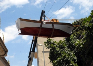 Uzun yıllar Almanya’da çalıştıktan sonra Fethiye’ye yerleşen marangoz ustası Şener Vicir, komşusuna ait evin balkonunda imal ettiği 5 metrelik tekneyi denize vinçle indirebildi.