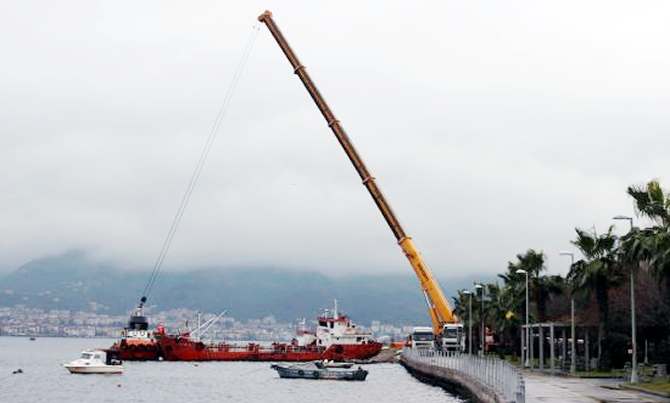 Aynı görüntülerde, kara vinciyle denizden çıkarılmaya çalışılan gemilerin iskele bordasında yakıt sızıntısına benzeyen görüntüler yer alırken, gemilerin denizden çıkarılma operasyonunda deniz çevresine deniz kirliliğini engelleyici hiç bir önlemin alınmaması dikkat çekiyor.