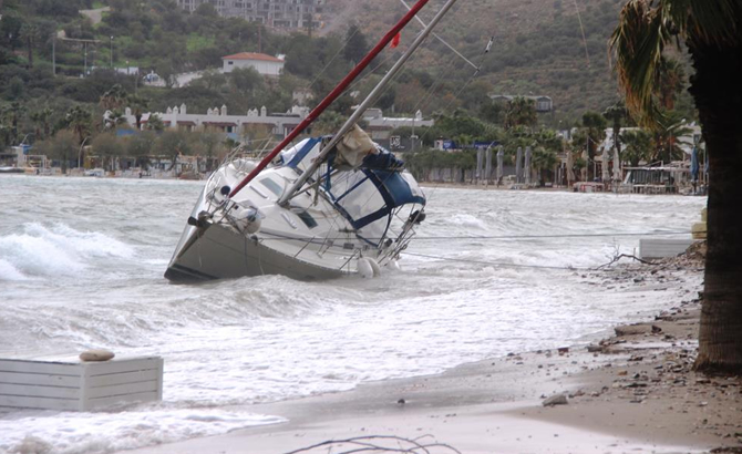 Sahile kadar sürüklenen 700 bin lira değerindeki yelkenli tekne, Bitez sahiline vurdu. Fırtınanın şiddetini arttırdığı saatlerde oluşan dev dalgalar nedeniyle kuru yük gemileri de koylara sığındı.
