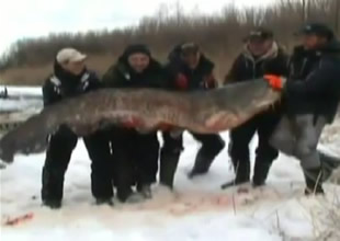 Rusya'da Volga Nehri kenarında balık tutan balıkçılar oltalarına takılan balığı görünce hayrete düştü. Balıkçıların oltalarına 195 kg ağırlığında dev bir kedi balığı takıldı. Balığı kıyıya çektikten sonra bir müddet gözlerine inanamayan arkadaşlar daha sonra 195 kiloluk dev kedi balığı ile kameralara poz verdi. Bir balıkçının çektiği görüntüde diğer 5 balıkçı arkadaşın dev kedi balığını güçlükle kaldırdıkları görülüyor.