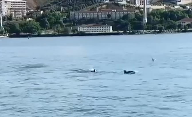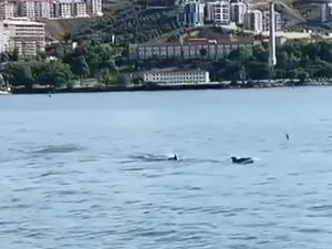 Bursa'nın Gemlik ilçesinde sahile gelen yunuslar, vatandaşlar tarafından böyle görüntülendi.