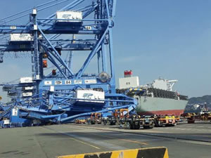 Busan Limanında Milano Bridge isimli konteyner gemisi, üç vinç ve bir başka gemiye çarptı.Geminin çarpmasının etkisiyle vinçler devrildi.