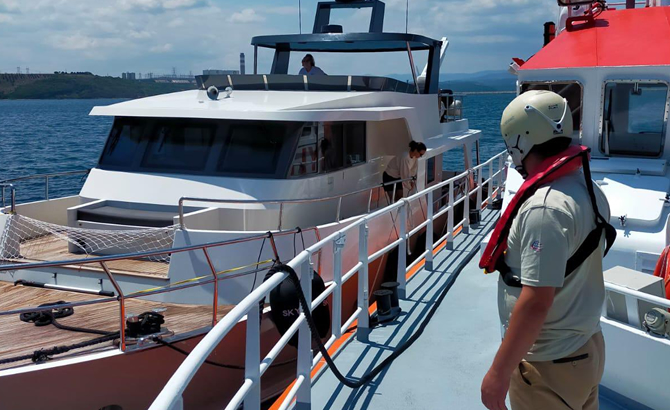 “Çanakkale Biga açıklarında makine arızası nedeniyle sürüklenen ve içinde 1'i çocuk 5 kişi bulunan 18 metre boyundaki tekne, KIYEM-4 botumuzca yedeklenerek Kemer/Biga Limanı'na emniyetle yanaştırıldı.”