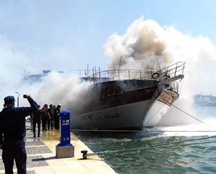 Yangının devam ettiği tekneye müdahale sürüyor.