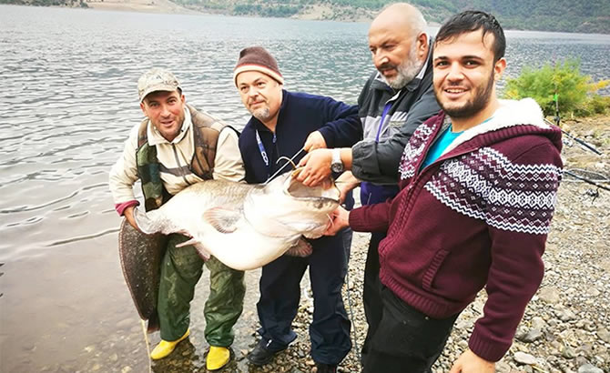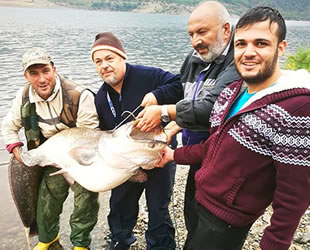 Çorum’un Oğuzlar ilçesinde Kızılırmak Nehri üzerindeki Obruk Baraj Gölü'nde avlanan balıkçıların oltasına, 1.85 metre boyunda ve 97 kilogram ağırlığında dev yayın balığı takıldı.
