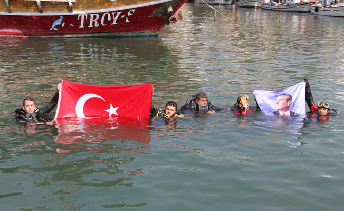 Dalgıçlar, çalışmanın ardından denizde Türk Bayrağı ve Atatürk posteri açarak, izleyenleri selamladı. Dalgıçların daha önce yaptıkları temizlikte denizden çıkardıkları çöpler de Balıkçı Barınağı kıyısında ‘Deniz Çöpleri Sergisi’ adıyla sergilendi.