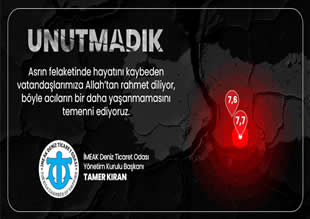 İMEAK Deniz Ticaret Odası Yönetim Kurulu Başkanı Tamer Kıran 6 Şubat 2023 tarihinde meydana gelen ve 11 ilimizi derinden etkileyen depremlerin yıl dönümü dolayısıyla bir anma mesajı yayımladı. Kıran mesajında şu ifadeleri kullandı:
