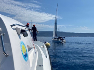 Sahil Güvenlik Komutanlığı ekipleri, yasadışı yollarla yurt dışına çıkmak isteyen Urla açıklarında İtalya rotası üzerinde bulunan yelkenli teknede bir grup düzensiz göçmen fark etti.
