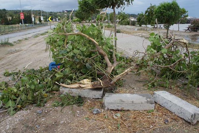 Dün öğleden sonra bir anda bastıran fırtına ve yağmur Marmara ilçesinde kurulan pazardaki tezgahların devrilmesine neden oldu. Denize giren vatandaşlar kapalı alanlara girmek zorunda kaldı. Marmara Adalar Belediye Başkanı Süleyman Aksoy, "Önce dolu bastırdı. Sonra sağanak yağmur ve fırtına 15 dakika sürdü. İlçede açık pazar yerindeki bazı tezgahların fırtına nedeniyle devrildiğini duyduk. Başkada önemli bir şey yok" dedi.