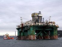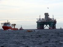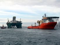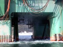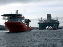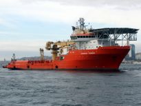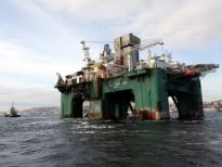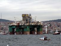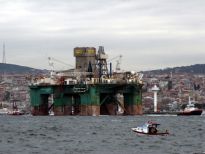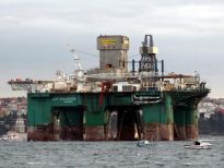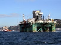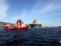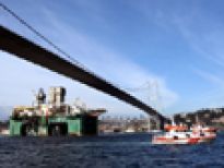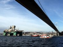Karadeniz’de petrol arama çalışmasına katılacak olan dev petrol arama platformu "Leiv Eiriksson", 2 güvenlik botu, 4 römorkör ve 5 kılavuz kaptanın eşlik etmesiyle 3 saatte İstanbul Boğazı’ndan geçiş yaptı.