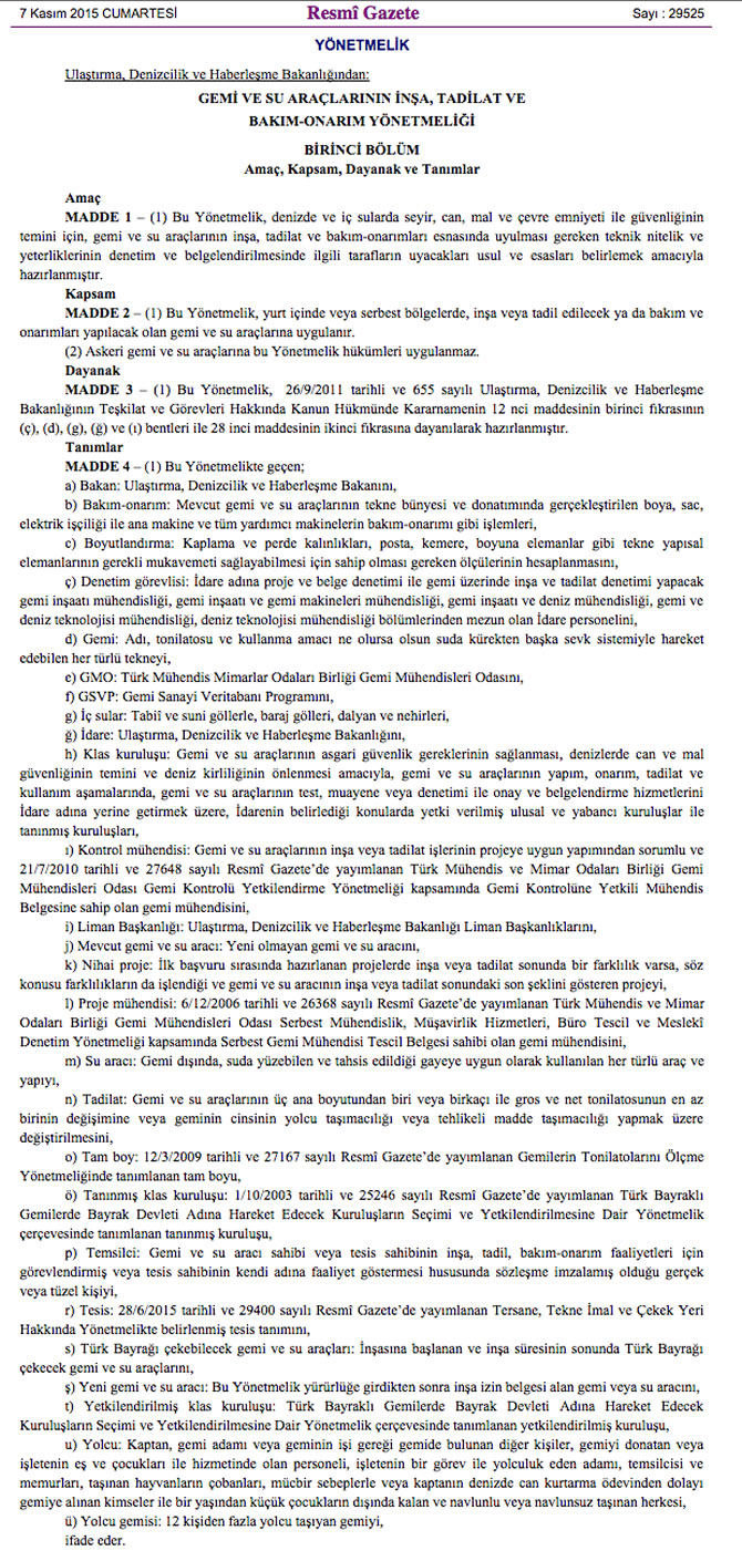 Ulaştırma, Denizcilik ve Haberleşme Bakanlığının "Gemi ve Su araçlarının İnşa, Tadilat ve Bakım-Onarım Yönetmeliği" Resmi Gazete'de yayımlandı.