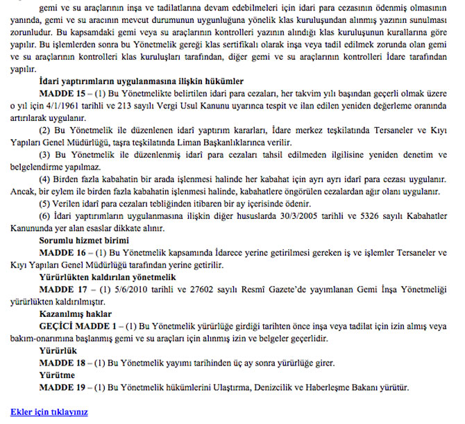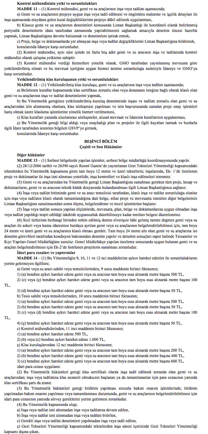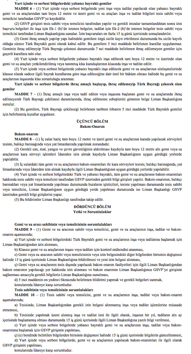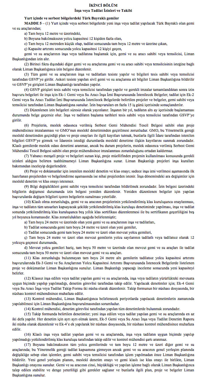 Buna göre gemi ve su aracı sahibi veya temsilcisi, boyu 12 metre ve üzerindeki, yolcu kapasitesi 12 kişiden fazla olan gemi ve su araçlarının inşa veya tadilatına başlamak için ilgili liman başkanlığından izin alacak. Bunların dışındaki diğer gemi ve su araçları için liman başkanlığınca izin belgesi düzenlenecek.