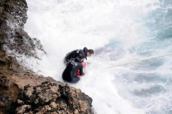 İki balık adam suya atlayarak genç kızın yanına ulaştı. Ümmü Gürci'ye can yeleği giydiren polisler genç kızı bota almak istedi. Ancak dalgalar botun karaya yaklaşmasına izin vermedi. Dev dalgalar polislere ve baygın haldeki genç kıza zor anlar yaşattı. Bir türlü polis botu karaya yaklaşamazken, polisler başka bir yol buldu. Polis botunda bulunan bir memur balık adamlara halat attı. Polisler genç kızın bacağından sıyrılan pantolonunu giydirmeye çalışırken aynı zamanda da dalgalarla boğuştu. İpi yakalayan polis memurları genç kızı belinden bağladı. Daha sonra bot hareket ederek baygın haldeki kızı açığa doğru çekmeye başladı. Genç kız açıkta güçlükle de olsa polis botuna bindirilerek Yat Limanı'na çıkartıldı. Burada hazır bekleyen ambulansa konulan Ümmü Gürci hemen Akdeniz Üniversitesi Hastanesi Acil Servisi'ne götürüldü. Gürci burada tedaviye alındı ancak yapılan tüm müdahalelere rağmen kurtarılamadı.