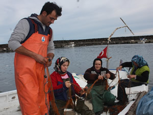 Eşlerine ve diğer yakınlarına yardım eden balıkçı kadınlardan Emine Civil, Birsen Kakıl ve Ayşe Yüksel, “Bizler balıkçı bir aileden gelmeyiz. Bu günlerde mezgit çok oluyor. Mezgitlerin ağlardan ayıklanmasında erkeklere yardım ediyoruz. Bazen denize de gittiğimiz oluyor” dediler.