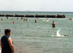 Yüzlerce vatandaşın serinlemek amacıyla denize girdiği halk plajının yaklaşık 75 metre açıklarında yapılan denizden boru çekimi, adeta faciaya davetiye çıkarıyor.