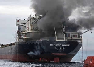 Görüntülerde, "MAYUREE NAREE - BANGKOK" yazılı kargo gemisinin kıç kısmından yoğun siyah dumanların yükseldiği görülüyor. Geminin su hattına yakın pervanesinin ve dümeninin hemen yanından devasa bir delik açıldığı, bu bölgeden alevlerin yükseldiği ve geminin sacının dışa/içe doğru parçalandığı net bir şekilde fark ediliyor.