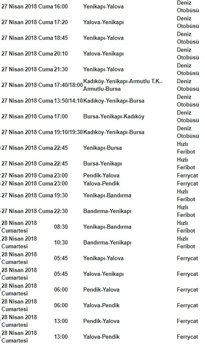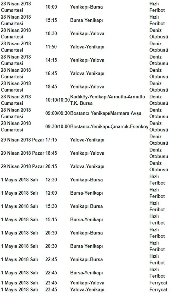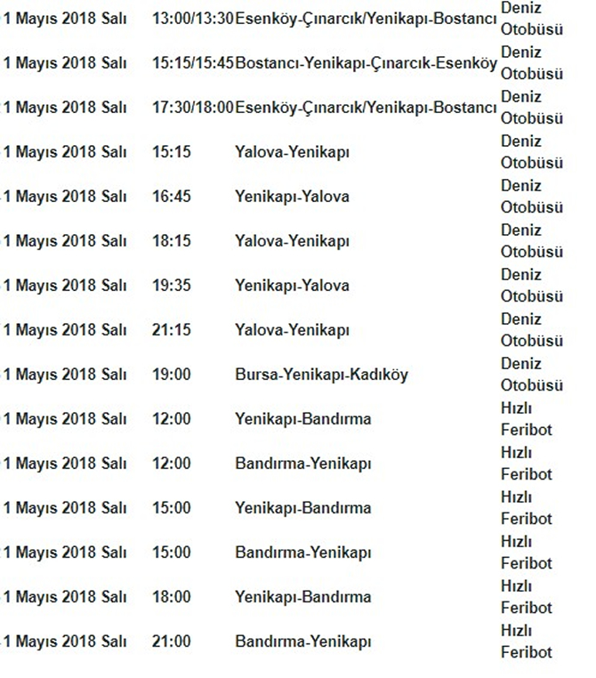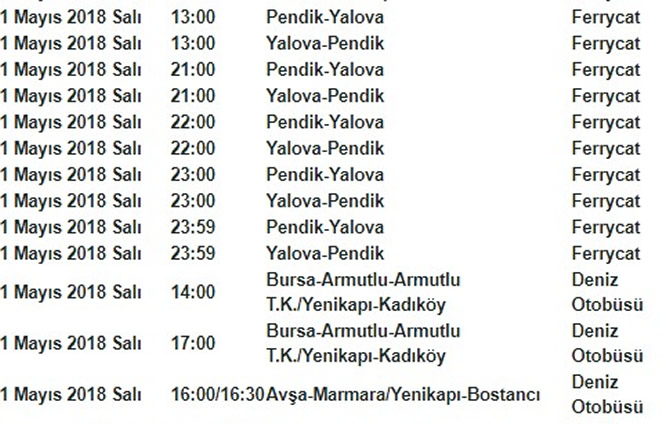 İDO, 1 Mayıs Emek ve Dayanışma günü tatilinin Salı gününe gelmesi nedeniyle de, Cuma-Cumartesi gidiş, Salı dönüş olmak üzere deniz otobüsü, hızlı feribot ve ferrycat seferleri için aşağıda listelenen 74 ek seferi satışa açtı.