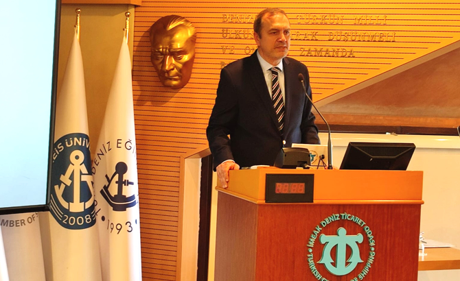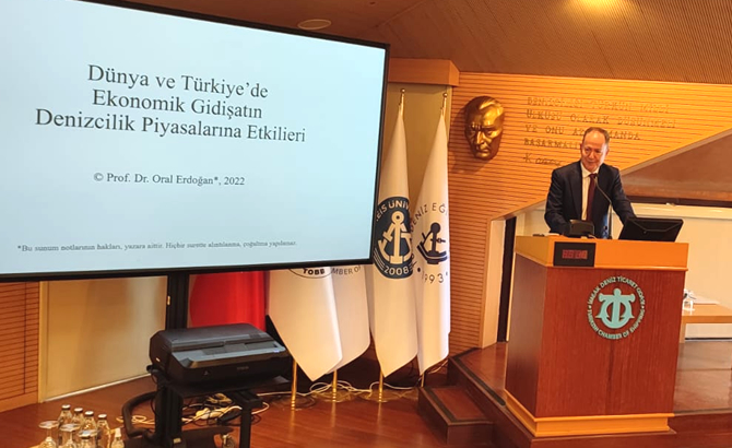 "Türkiye ve Dünya Ekonomoik Gidişatı ve Denizciliğe Etkileri" isimli bir sunum gerçekleştiren Piri Reis Üniversitesi Rektörü Prof. Dr. Oral Erdoğan, “Geçmişten bugüne yaptığım sunumlarda enflasyon sorununa çok değinmiştim. Küresel anlamda kriz mi geliyor gibi bir soru ile başlayacağım. Kendi adıma tahminlerimi ileteceğim. IMF Reel Büyüme Beklentileri tablosundaki büyümeyi tetikleyen ana faktör ABD. Diğer ülke ekonomilerini de etkileyen bir yapısı var ABD'nin. Dünya çapında büyüme oranı azalacak. Küresel enflasyon ise, tarihi rakamlara imza attı. Yüksek enflasyona ile yaşamaya alışmaya çalışıyoruz. Dünya'da enflasyonun yanında ciddi bir ticaret büyümesi yaşanıyor. Çin, dünya ticaretinde önemli bir pasta dilimine sahip. Dünya denizciliği Çin'e muhtaç gibi gözüküyor. Çin ve Amerika arasındaki ticaret hacmi Çin'in lehine ilerliyor. Dünya ticaretine yön veren ülke Çin olabilir mi? soruları etrafta dolanıyor. ABD, hızlı bir büyümeye doğru ilerliyor. ABD, enflasyonu 3-4 ay içerisinde düşürecek. ABD, bunu başarmış durumda iken, diğer ülkelerin de buna hazırlıklı olması gerekiyor” dedi.