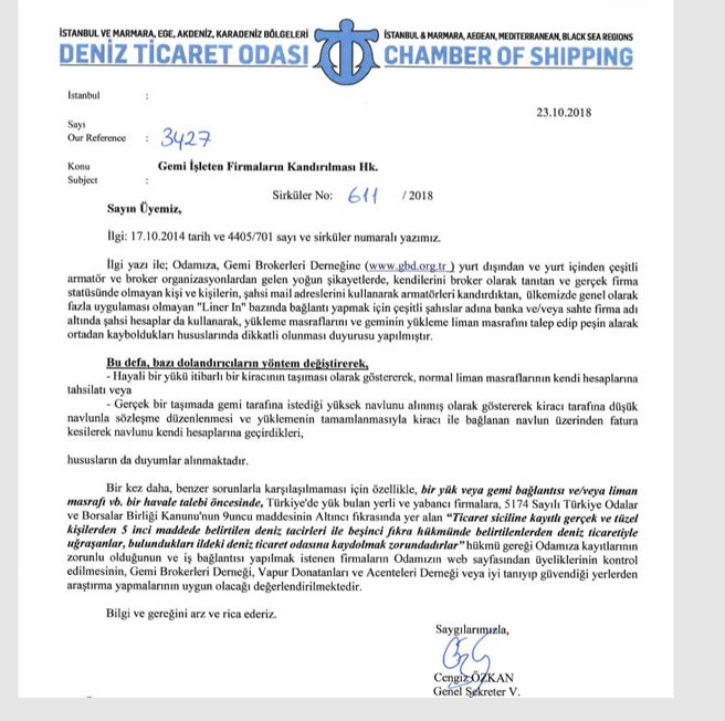 İlgi yazısı ile, Odamıza, Gemi Brokerleri Derneği’ne yurt dışından ve yurt içinden çeşitli armatör ve broker organizasyonlarından gelen şikayetlerde, kendilerini broker olarak tanıtan ve gerçek firma statüsünde olmayan kişi ve kişilerin, şahsi mail adreslerini kullanarak armatörleri kandırdıktan, ülkemizde genel olarak fazla uygulaması olmayan “Liner In” bazında bağlantı yapmak için çeşitli şahıslar adına banka ve/veya sahte firma adı altında şahsi hesaplar da kullanarak, yükleme masraflarını ve geminin yükleme liman masrafını talep edip peşin alarak ortadan kayboldukları hususlarında dikkatli olunması duyurusu yapılmıştır.