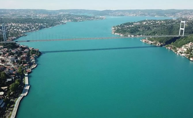 Turkuaz rengiyle muhteşem bir görsel oluşturan İstanbul Boğazı havadan fotoğraflandı.