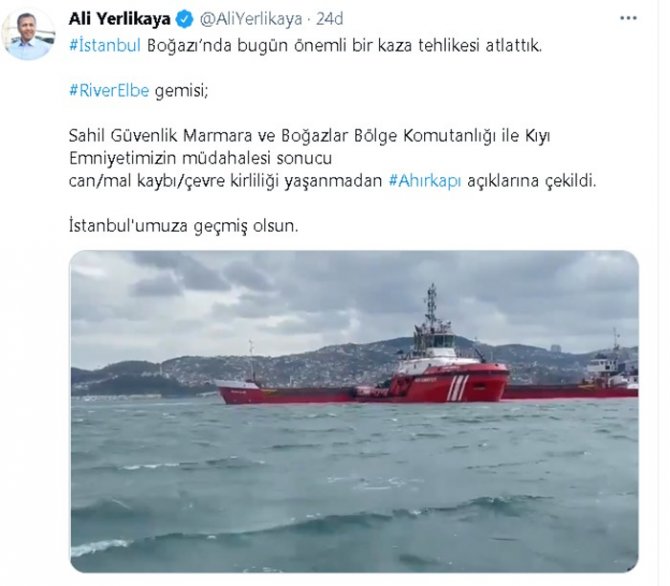 İstanbul Valisi Ali Yerlikaya, sosyal medyadan yaptığı açıklamada, “İstanbul Boğazı’nda bugün önemli bir kaza tehlikesi atlattık. River Elbe gemisi; Sahil Güvenlik Marmara ve Boğazlar Bölge Komutanlığı ile Kıyı Emniyetimizin müdahalesi sonucu can/mal kaybı/çevre kirliliği yaşanmadan Ahırkapı açıklarına çekildi. İstanbul’umuza geçmiş olsun” dedi.
