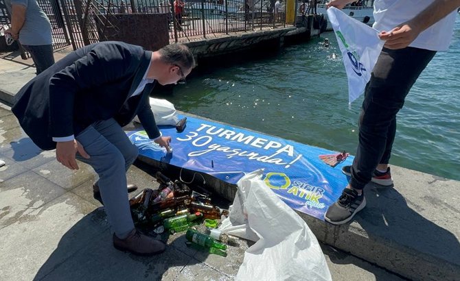 Dip temizliği için dalgıçlar çuvallarla suya daldı. Bir süre sonra yüzeye çıkan dalgıçlar, deniz dibinden topladığı atık maddeleri kaldırımda sergiledi.