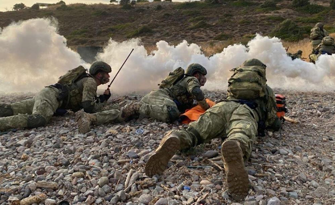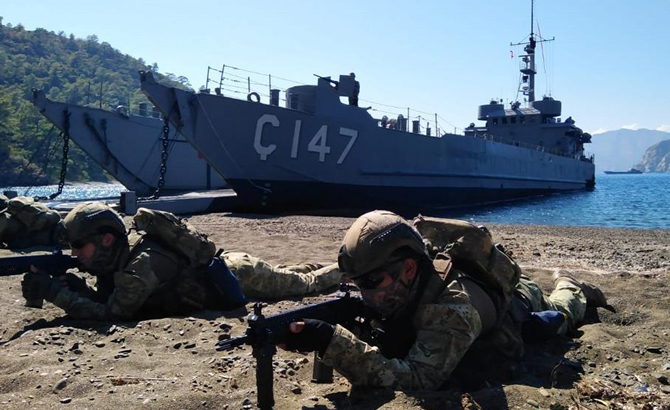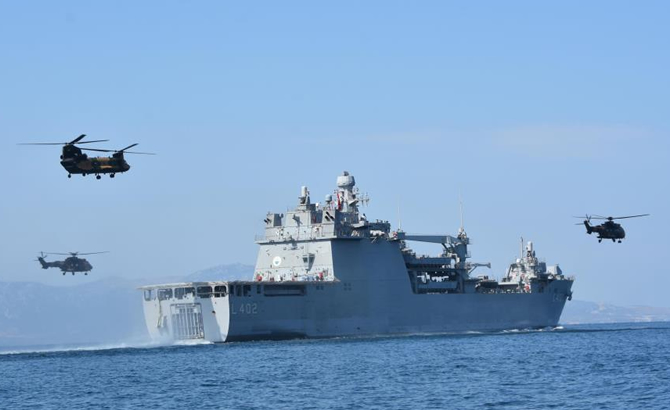 “Amfibi Görev Grup Komutanlığı Harekâta Hazırlık Eğitimleri, İzmir Körfezi’nde Kara Kuvvetleri Komutanlığı’ndan helikopter ile tank çıkarma gemileri, araçları ve tabur çıkarma timlerinin katılımıyla gece ve gündüz şartlarında başarılı şekilde icra edildi.”