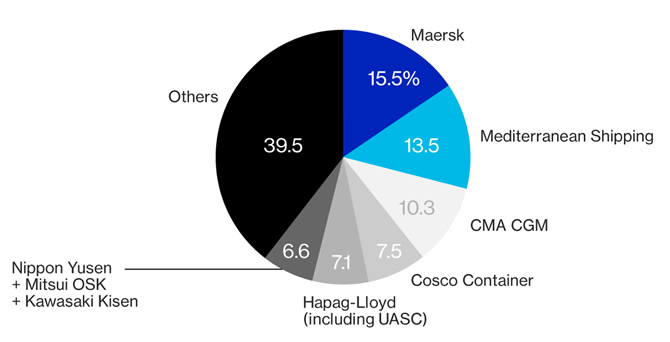 Dünyanın 11'nci hat operatörü olan MOL, 510 bin 329 TEU taşıma kapasitesine sahip 82 gemiyle pazardan yüzde 2,5 pay alırken, dünyanın 12'nci hat operatörü NYK ise 505 bin 969 TEU taşıma kapasitesine sahip 97 gemiyle konteyner pazarından yüzde 2,4 pay alıyor. Öte yandan dünyanın 15'nci konteyner hat operatörü K Line ise 352 bin 230 TEU taşıma kapasitesine sahip 60 gemiyle yüzde 1,7 payı bulunuyor.