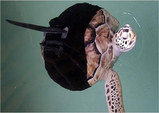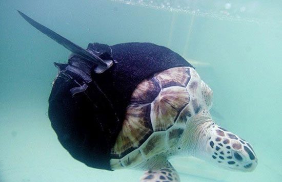 Allison isimli kaplumbağa, kendisi için özel olarak tasarlanan ve kabuğuna monte edilen yapay bir yüzgeçle, eskisi gibi yuvarlaklar çizmek yerine yüzebiliyor.