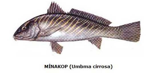 MİNAKOP: Kötek balığı da denir. Bütün denizlerimizin taşlık, kayalık bölgelerinin 100-150 metreye varan derinliklerinde, dibe yakınlarında yalnız yaşar. Zaman zaman acı sulara ve nehir ağızlarına da girer. Eşkina ve sarıağızla aynı türdendir. Yumuşakça, kabuklu ve kurtlarla beslenir. Yaşadığı bölgenin şartlarına göre üremesini nisandan ağustosa kadar sürdürür. Sert ve beyaz etinin lezzeti levreğe yaklaşır.