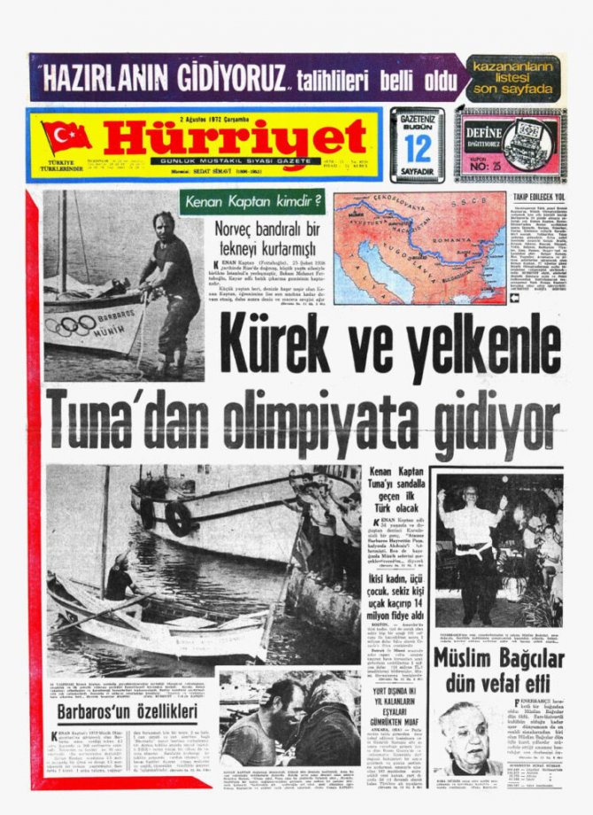 Kenan Kaptan adlı 34 yaşında ve doğuştan denizci Karadenizli bir genç, “Atamız Barbaros Hayrettin Paşa, kalyonla Akdeniz’i fethetmişti. Ben de kayığımla Münih seferini gerçekleştireceğim diyerek “Barbaros” adlı teknesiyle denize açılmıştır.