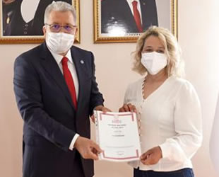 Rektör Prof. Dr. Necdet Budak, su kirliliğine karşı geliştirdiği çalışmayla patent almaya hak kazanan Doç. Dr. Deniz Çiftçi'yi makamında ağırlayarak tebrik etti.
