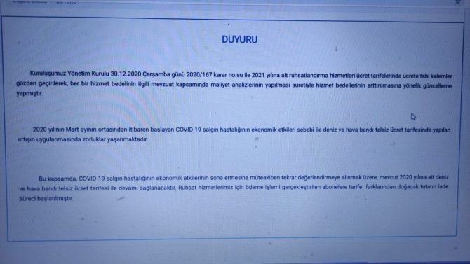 Bu kapsamda, COVID-19 salgın hastalığının ekonomik etkilerinin sona ermesine müteakiben tekrar değerlendirmeye alınmak üzere, mevcut 2020 yılına ait deniz ve hava bandı telsiz ücret tarifesi ile devamı sağlanacaktır. Ruhsat hizmetlerimiz için ödeme işlemi gerçekleştirilen abonelere tarife farklarından doğacak tutarın iade süreci başlatılmıştır.”