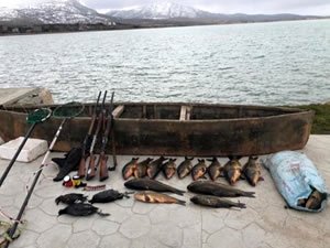 Ada kıyısındaki sazlık alanlara gelindiğinde kendilerine yaklaşan bir teknenin olduğunu gören şahısların, balıkçı teknesinin içerisinde bulunan malzemeleri sazlık içerisine atarak seyre devam ettikleri fark edildi. Kaçmaya çalışan balıkçı teknesinin içerisinde bulunan T.D., A.Ö., H.Ç., K.A. ve D.A. isimli şahıslar kısa sürede durdurulan teknede yakalandı. Teknenin seyir yaptığı bölgede yapılan arama ve kontrollerde önce göl içerisinde tüfekle vurulmuş ve saçma izleri olan, kanamaları devam eden 2 adet sakar meke ve 1 adet elma baş patka ördek bulundu. Ördeklere yaklaşık 5 metre mesafede ise göl içerisine atılmış av tüfekleri ele geçirildi. Aramalarda ayrıca av tüfeklerinin bulunduğu mevkiye yaklaşık 15 metre mesafede sazlık alanda birbirine 2 metre mesafede içerisinde çok sayıda sazan balığı olan iki ayrı çuval fark edildi. Çuvalların sudan çıkarılmasının ardından sazlar arasına gizlenmiş filikada bulundu. Filikanın içerisinde elektroşok yöntemiyle kullanılan balık toplama filesi ile yakınında yaklaşık 4 metre uzunluğunda akü bağlantı kablosu ele geçirildi. Avcıların göl sularına attıkları elektroşokla avcılıkta kullanılan akü ve invertör adlı cihaz ise yapılan tüm aramalara rağmen alanın sık sazlık, göl dibinin otluk ve bataklık olması sebebiyle bulunamadı. Ekipler denetimlerde elektroşok yöntemiyle avlandığı belirlenen 120 kilo sazan balığı, ateşli silahla vurulmuş 2 adet sakar meke ve 1 adet ermabaş patka ördek ile 1 filika, ruhsatsız 3 otomatik ve takozsuz av tüfeği, çok sayıda fişek, kepçe, kafa ışığı ve akü bağlantı kablolarına el koydu.