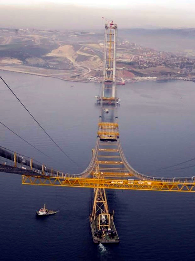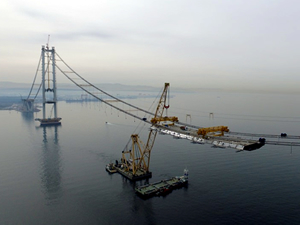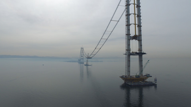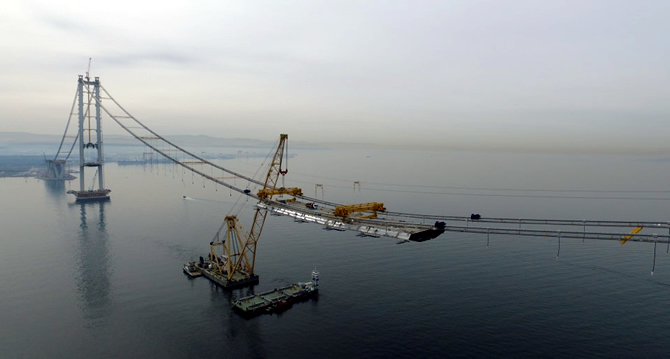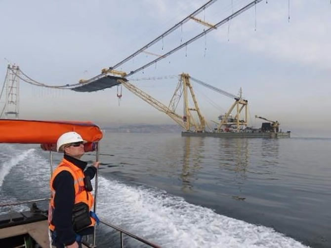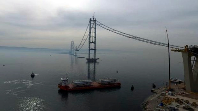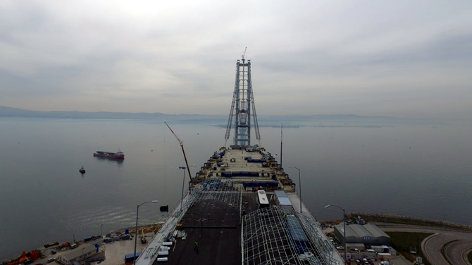 Ulaştırma Bakanı Yıldırım’ın 2016 yılının Mayıs ayı içinde ulaşıma açılacağını açıkladığı İzmit Körfez Geçiş köprüsünde tabliyeler birbiri ardına döşeniyor. İstanbul-İzmir arasındaki yolun 3,5 saate inmesini sağlayacak 433 kilometre uzunluğundaki projenin şu ana kadar yüzde 57’lik bölümünün tamamlandığı belirtildi.