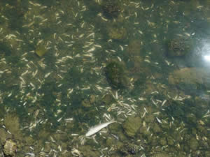 Küçükçekmece Gölü'nde henüz belirlenemeyen nedenle ölen binlerce balık ve yengeç kıyıya vurdu.