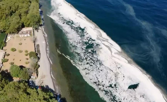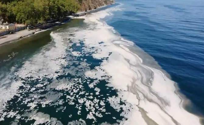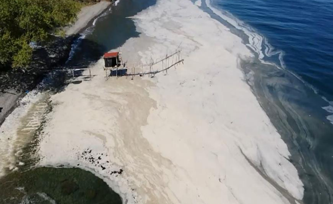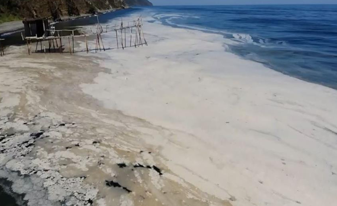 Marmara Denizi’nde yaklaşık 3 aydan beridir etkili olan deniz salyası, Tekirdağ’da deniz kıyısı boyunca yüzeye çıkarak denizde beyaz tabaka oluşturdu.