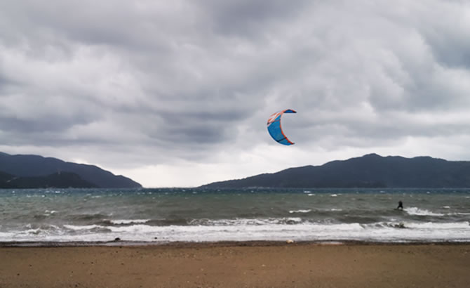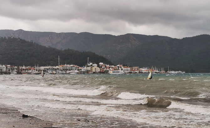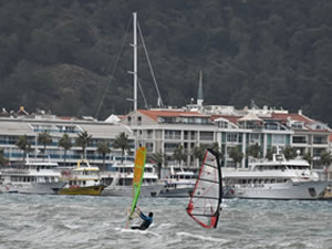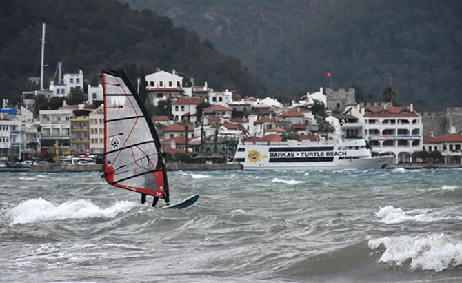 Rüzgar sörfçüleri meteorolojiyi herkesten daha çok takip ediyor ve sörf tahtalarını, yelkenlerini ve deniz paraşütlerini alıp kendilerini dalgalara bırakıyor. Marmaris'te de lodosu fırsat bilen sörfçüler denizdeydi.
