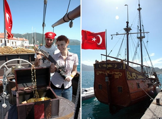 14 metre uzunluğunda ve 7 metre genişliğindeki korsan teknesi, biri süit 3 kamaralı ve 6 kişilik. Bu arada, teknenin içinin korsanlar tarafından kullanılan balta, kılıç ve hazine sandığı gibi aksesuarlarla süslenmesi dikkat çekti.