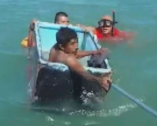 Ekipler, iki balıkçıyı suyun üzerinde kapağı çıkarılmış bir buzdolabının içerisinde buldu.