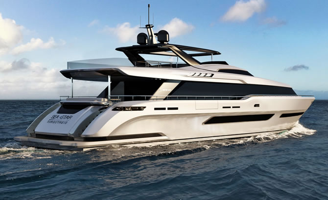 VYD tarafından yapılan göz alıcı dış tasarım ve BTA tarafından üstlenilen sofistike iç tasarımı ile Sea Star, keskin hatları ve koyu gri metalik dış görünüme sahip lüks ve çok yönlü bir motor yat. İç mekân detayları tamamen açılabilir salon tasarımı, yan balkonları ve beach club özellikleri ile normalde 40+ yatların sahip olduğu özelliklere hâkim.