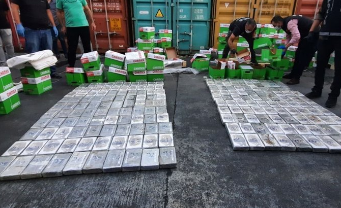 Mersin Cumhuriyet Başsavcılığı’ndan yapılan açıklamaya göre; Mersin Emniyet Müdürlüğü Narkotik Suçlarla Mücadele Şube Müdürlüğünce uyuşturucu veya uyarıcı madde imalatı ve ticareti yapan şahısların deşifre edilmesi, suç unsurları ile birlikte yakalanmasına yönelik olarak yapılan çalışmalarda Mersin Limanı’na yüklü miktarda uyuşturucu getirileceği tespit edildi. Yürütülen soruşturma neticesinde Brezilya’dan gelerek Mersin Limanı’na aktarması yapılan A4 kağıdı yüklü konteynırda Gümrük Muhafaza Kaçakçılık ve İstihbarat Müdürlüğü ile birlikte yapılan aramada 200 paket halinde 220 kilogram kokain ele geçirildi. Olayla ilgili 2 zanlı gözaltına alındı.